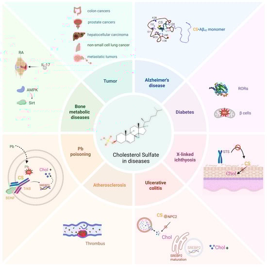 CS is implicated in various diseases. CS plays an important biological role in various diseases, such as different types of cancers, Alzheimer’s disease, Atherosclerosis, diabetes, X-linked ichthyosis, and ulcerative colitis. This figure was created in Biorender. Yu, X. (2025) https://BioRender.com/ls81p2c (accessed on 10 March 2025).