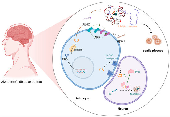 CS in Alzheimer’s disease. CS binds to amyloid precursor protein (APP) and promotes the cleavage of APP into aggregation-prone Aβ42, fostering the formation of Aβ plaques. Sult2b1b in the astrocyte cytosol converts cholesterol into CS, both of which are provided by the astrocyte to the mature neuron via the ATP-binding cassette transporter-2 (ABCA2), which does not synthesize cholesterol. Once in the neuron, CS binds protein kinase C (PKC), causing it to hyperphosphorylate tau protein fibrils, which aggregate into toxic neurofibrillary tangles. This figure was created in Biorender. Yu, X. (2025) https://BioRender.com/7dts6k3 (accessed on 10 March 2025).