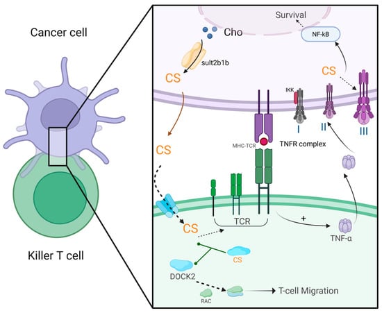 CS in cancer biology. In cancer cells, Sult2b1b synthesizes CS, which is exported to the extracellular space via transporters. Upon entering mature killer T cells, CS binds to DOCK-2, blocking its ability to activate Ras-related C3 botulinum toxin substrate GTPase (RAC). This inhibition traps RAC in an inactive GDP-bound state, impairing T-cell migration and tumor infiltration. Simultaneously, CS binds the transmembrane domain of the TCR, preventing its dimerization and disrupting the formation of functional TCR-MHC complexes, thereby suppressing antigen recognition and cytokine release (e.g., TNFα). Within the cancer cell, elevated CS levels redirect TNFα signaling the following: instead of promoting apoptosis via FADD/caspase-8 activation (Complex II), TNFα binding stabilizes a pro-survival TNFR complex (Complex III). The pro-survival pathway is initiated by the activation of IKK, which phosphorylates IκB, causing release of NF-κB and exposing its nuclear-localization signaling peptide. As a result, NF-κB translocates to the nucleus and alters gene expression to inhibit apoptosis and promote survival. This figure was created in Biorender. Yu, X. (2025) https://BioRender.com/2bm0ov0 (accessed on 10 March 2025).