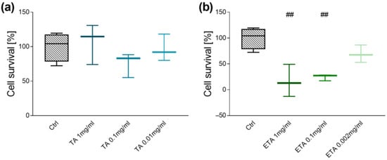 Cell survival of organoids treated with TA (1 mg/mL, 0.1 mg/mL, 0.01 mg/mL) (a), or Eta (1 mg/mL, 0.1 mg/mL, 0.002 mg/mL) (b), or with PBSO as control for 30 h (n = 3). Data are presented as means ± SEM and were analyzed by one-way ANOVA with Dunnett’s multiple comparisons test or Kruskal–Wallis test with Dunn’s multiple comparisons test. Differences between two groups were analyzed by using unpaired t-test or Mann–Whitney test. Significant differences to PBSO control are indicated as ## p-value < 0.01.