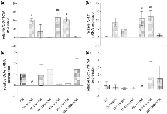 Consistently, examinations of inflammatory markers by RT-PCR demonstrated that TA up to 0.01 mg/mL and Eta up to 0.002 mg/mL did not induce IL-1β or IL-6 mRNA expression in small intestinal organoids. At higher concentrations, 1 mg/mL TA (p < 0.05), 1 mg/mL Eta (p < 0.01), and 0.1 mg/mL Eta (p < 0.05) induced IL-6 expression (Figure 2a). Further, organoid stimulation with 1 mg/mL Eta (p < 0.05) and 0.1 mg/mL Eta (p < 0.01) upregulated IL-1β mRNA expression (Figure 2b).