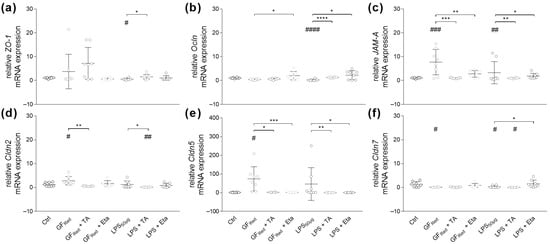 GFRed- and LPS-induced stress causes multiple disturbances in TJ and AJ gene expression, whereas TA at 0.01 mg/mL and Eta at 0.002 mg/mL partially reverse these effects. Organoids were treated as previously described in Table 3. Relative mRNA expression levels of ZO-1 (a), Ocln (b), JAM-A (c), Cldn2 (d), Cldn5 (e), and Cldn7 (f) were determined by quantitative RT-PCR. Data are presented as means ± SEM (n = 8). Statistical analysis was performed by one-way ANOVA with Dunnett’s multiple comparisons test or Kruskal–Wallis test with Dunn’s multiple comparisons test. Differences between two groups were analyzed by using unpaired t-test or Mann–Whitney test. Significant differences to PBSO control are indicated as # p-value < 0.05; ## p-value < 0.01; ### p-value < 0.001; #### p-value < 0.0001. Significant differences between two groups are indicated as * p-value < 0.05; ** p-value < 0.01; *** p-value < 0.001; **** p-value < 0.0001.