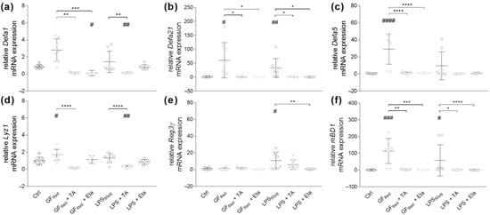 GFRed- and LPS-induced stress is associated with increased antimicrobial peptide transcripts expression, which is normalized by co-stimulation with TA at 0.01 mg/mL or Eta at 0.002 mg/mL. Organoids were treated as previously described in Table 3. Relative mRNA expression levels of Defa1 (a), Defa21 (b), Defa5 (c), Lyz1 (d), Reg3γ (e), and mBD1 (f) were determined by quantitative RT-PCR. Data are presented as means ± SEM (n = 8). Statistical analysis was performed by one-way ANOVA with Dunnett’s multiple comparisons test or Kruskal–Wallis test with Dunn’s multiple comparisons test. Differences between two groups were analyzed by using unpaired t-test or Mann–Whitney test. Significant differences to PBSO control are indicated as # p-value < 0.05; ## p-value < 0.01; ### p-value < 0.001; #### p-value < 0.0001. Significant differences between two groups are indicated as * p-value < 0.05; ** p-value < 0.01; *** p-value < 0.001; **** p-value < 0.0001.