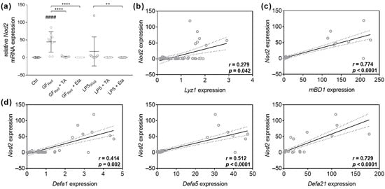 GFRed-mediated stress in organoids increased Nod2 mRNA expression (p < 0.0001), whereas LPS exposure had no effects (Figure 6a). Interestingly, co-stimulation of GFRed-treated organoids with TA or Eta was found to reduce Nod2 gene expression (p < 0.0001, Figure 6a), while exposure of organoids to TA or Eta revealed no effects on Nod2 gene expression (Figure S5). While Spearman rank correlation analysis revealed no correlation between Nod2 and Reg3γ (Figure S6), there was a weak positive correlation between Nod2 mRNA levels and Lyz1 gene expression (r = 0.279, p = 0.042, Figure 6b). Further, there was a moderate positive correlation between Nod2 and the expression of Defa1 (r = 0.414; p = 0.002), and Defa5 (r = 0.512; p < 0.0001, Figure 6d) and a strong positive correlation between the expression of Nod2 and mBD1 (r = 0.774; p < 0.0001) as well as Defa21 expression (r = 0.729; p < 0.0001, Figure 6c,d).