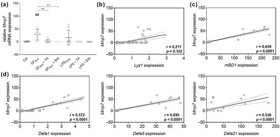 Additionally, measurements demonstrated that stress conditions caused by GFRed resulted in an increase of Mmp7 expression (p < 0.01), whereas this effect was absent when organoids were co-incubated with TA or Eta (p < 0.01). Further, organoids treated with Eta showed a reduction of Mmp7 transcript expression (p < 0.05, Figure S5). In contrast, no effects on Mmp7 expression were observed under LPS exposure (Figure 7a). We next performed Spearman rank correlation analysis. Examinations demonstrated a weak positive correlation between Mmp7 and Lyz1 gene expression (r = 0.211, p = 0.122, Figure 7b), as well as moderate positive correlation between Mmp7 and Defa1 (r = 0.572; p < 0.0001), and Defa21 (r = 0.536; p < 0.0001, Figure 7d). Moreover, we found a strong positive correlation between Mmp7 and mBD1 (r = 0.659; p < 0.0001) and Defa5 gene expression (r = 0.659; p < 0.0001, Figure 7c,d). However, no correlation was found between Mmp7 and Reg3γ (Figure S6).