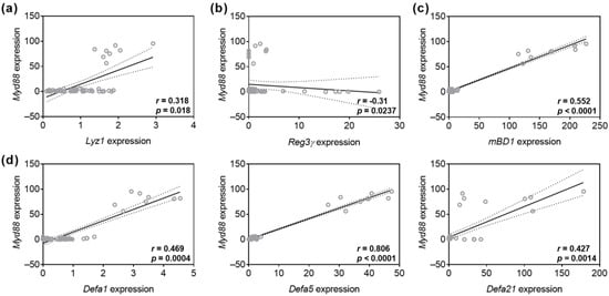 As antimicrobial peptide defense has been linked with the TLR/Myd88 signaling pathway, we next analyzed potential associations between Myd88 and AMP mRNA expression. Examinations demonstrated a weak positive correlation between Myd88 and Lyz1 gene expression in small intestinal organoids (r = 0.318, p = 0.018, Figure 8a). Interestingly, there was a weak negative correlation between the expression of Myd88 and Reg3γ mRNA levels (r = −0.31, p = 0.0237, Figure 8b). We also identified a moderate positive correlation between Myd88 and mBD1 (r = 0.552; p < 0.0001, Figure 8c), Defa1 (r = 0.469; p = 0.0004), and Defa21 gene expression (r = 0.427, p = 0.0014, Figure 8d). Moreover, analysis revealed a very strong positive correlation between Myd88 and Defa5 expression (r = 0.806; p < 0.0001, Figure 8d).