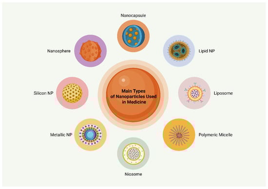 However, there are other classifications of NPs as well. In particular, NPs have also been classified as liposomes, nanospheres, polymeric micelles, solid lipids, metallic NPs, niosomes, and porous silicon NPs []. Niosomes are very similar to liposomes, but carry a non-ionic surfactant arranged in bilayers and stabilized by cholesterol. Due to their non-ionic nature, niosomes exhibit a very low toxicity rate and increased bioavailability [,]. In addition, metallic NPs are made of a metal structure, mainly gold, silver, zinc or iron oxide. Their major advantage is their ability to reach the targeted area with enhanced accuracy []. Nevertheless, as the field of nanomedicine is exponentially growing, it is expected that a variety of NPs will be discovered and exploited in the near future. Therefore, the classification of NPs seems to be constantly changing. Figure 1 illustrates the primary classes of NPs utilized in medicine.