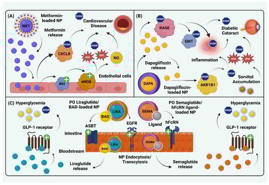 Nanomedicine strategies for targeted drug delivery in diabetes mellitus. (A) A nano-pharmaceutical formulation enriched with metformin enabled controlled drug release, leading to a reduction in CXCL8 levels in endothelial cells. Concurrently, metformin activated Akt, which in turn stimulated eNOS, resulting in NO production and attenuation of oxidative stress. Overall, endothelial function was preserved, offering cardiovascular benefits []. (B) A dapagliflozin-enriched nanocarrier, when administered as a nano eye-drop, enhanced the aqueous solubility of dapagliflozin, increasing its efficacy in diabetic cataract treatment. Dapagliflozin reduced AKR1B1 expression, leading to decreased sorbitol accumulation and mitigation of oxidative stress. Additionally, it downregulated RAGE, thereby attenuating both inflammation and EMT, ultimately preserving lens integrity []. (C) A nanoparticle loaded with liraglutide, and BADs interacted with ASBT on the surface of intestinal epithelial cells. Upon nanoparticle binding to ASBT, bile acids were recognized and transported intracellularly. Simultaneously, liraglutide, incorporated within the nanoparticle, activated EGFR, promoting endocytosis and transcytosis. The nanoparticle traversed the intestinal epithelium and entered systemic circulation, releasing liraglutide, which subsequently acted on GLP-1 receptors to regulate blood glucose levels []. Similarly, oral semaglutide was encapsulated in a nanoparticle surface-modified with either a peptide or an affibody targeting hFcRn. The nanoparticle was bound to hFcRn on enterocyte surfaces, facilitating endocytosis and transcytosis across the intestinal barrier. This mechanism enhanced gastrointestinal stability and absorption of semaglutide, which otherwise exhibits low permeability due to its high molecular weight, thereby ensuring its anti-hyperglycemic effect through GLP-1 receptor activation []. Abbreviations: AKR1B1: aldose reductase 1B1; ASBT: apical sodium-dependent bile acid transporter; BAD: bile acid derivative; CXCL8: C-X-C motif chemokine ligand 8; DAPA: dapagliflozin; eNOS: endothelial nitric oxide synthase; EGFR: epidermal growth factor receptor; EMT: epithelial–mesenchymal transition; GLP-1: glucagon-like peptide-1; hFcRn: human neonatal Fc receptor; LIRA: liraglutide; MET: metformin; NO: nitric oxide; NP: nanoparticle; RAGE: receptor for advanced glycation end-products; PO: per oral; SEMA: semaglutide; +: activation; →: leads. Created in BioRender. Kounatidis, D. (2025) https://BioRender.com/m12t721. Assessed on 16 March 2025.