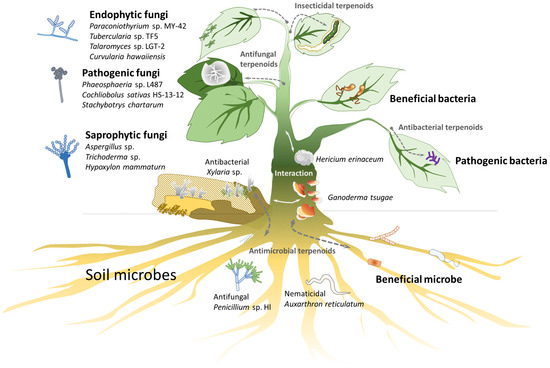 Fungi and bacteria coexist with plants in ecosystems (Figure 3). To compete for limited carbon resources (sugars), microbes need to obtain sugars quickly and/or kill other microbes. Plants and fungi produce terpenoids as chemical defenses to kill other microbes or insects [37]. Autotrophic plants have diverse terpenoids and terpenoid glycosides, whereas heterotrophic fungi have some terpenoids and few terpenoid glycosides, likely due to the lack of specific GTs.