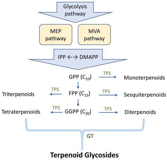 Biosynthetic pathway of terpenoid glycosides. MEP: 2-C-methylerythritol 4-phosphate pathway; MVA: mevalonate pathway; IPP: isopentenyl pyrophosphate; DMAPP: dimethylallyl pyrophosphate; GPP: geranyl pyrophosphate; FPP: farnesyl pyrophosphate; GGPP: geranylgeranyl pyrophosphate; TPS: terpene synthase; GT: glycosyltransferase.