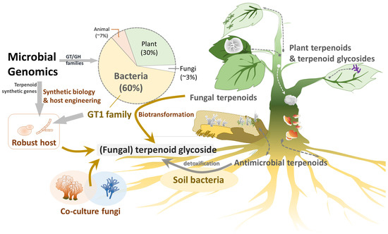 Strategies for searching for novel terpenoid glycosides. Bacterial GTs may biotransform plant and fungal metabolites, such as terpenoids and phenolics, into glycosides, which may alter the activity of the original metabolites in terms of solubility, bioavailability, and detoxification. In practice, these enzymes can be assessed by combining novel bacterial GT and GH genes with gene clusters for aglycone scaffolds in suitable hosts. In addition, co-culturing microbes with natural compounds or precursors may also help isolate novel derivatives.