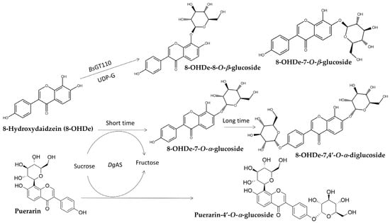 Glycosylation of 8-hydroxydaidzein (8-OHDe) and puerarin by BsGT110 (8-OHDe) or DgAS (8-OHDe, puerarin).
