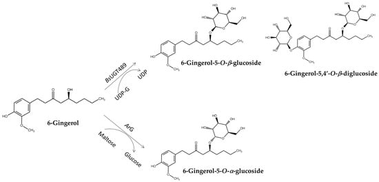 Glycosylation of 6-gingerol to either β-glycosides by GT (BsUGT489) or α-glycoside by GH (ArG).