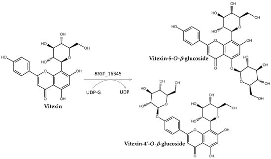 The newly identified GT28 enzyme, BsGT_16345, catalyzed the glycosylation of vitexin, a C-glucoside flavone with low solubility, to produce vitexin-4′-O-β-glucoside and vitexin-5-O-β-glucoside, both of which displayed greater aqueous solubility than vitexin (Figure 10) [81].