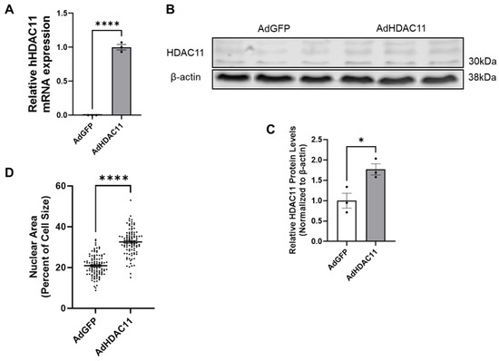 HDAC11 is successfully overexpressed in CMSCs following Ad-HDAC11 transduction. (A) Relative mRNA expression of hHDAC11 is significantly higher in the Ad-HDAC11 group compared to Ad-GFP controls, as assessed by qRT-PCR. There is almost no detectable expression of human HDAC11 in the Ad-GFP group. (B,C) Western blot analysis shows that HDAC11 protein levels, normalized to β-actin, are significantly increased in Ad-HDAC11-transduced CMSCs compared to Ad-GFP controls, confirming the successful overexpression of the human HDAC11 gene in mouse CMSCs (n = 3) (Original images can be found in the Supplementary Materials). (D) Nuclear size and total cell size were quantified using ImageJ 1.54f. Nuclear area as a percentage of total cell size is presented (n = 100). Data are presented as the mean ± SEM. * p ≤ 0.05, **** p ≤ 0.0001 by Student’s t-test.