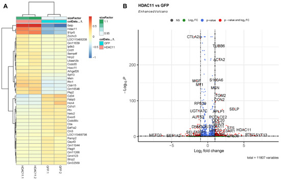 Differential gene expression in Ad-GFP- and Ad-HDAC11-transduced CMSCs. (A) A heatmap displays the most significant differentially expressed genes (DEGs) between Ad-GFP- and Ad-HDAC11-transduced CMSCs. The heatmap shows distinct clustering of genes based on expression patterns, with a clear separation between Ad-GFP and Ad-HDAC11 groups. (B) A volcano plot highlights the DEGs between the two groups. Genes with significant differential expression are represented as red dots. Upregulated genes in the Ad-HDAC11 group are shown on the right side of the plot, while downregulated genes are displayed on the left side. Notably, HDAC11 was one of the most highly upregulated genes detected in Ad-HDAC11-transduced CMSCs, confirming HDAC11 overexpression.