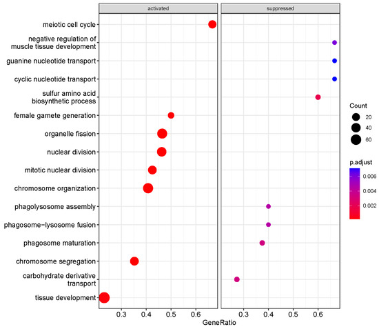 We performed a GO biological process (BP) enrichment analysis using the clusterProfiler package to identify pathways altered in HDAC11-overexpressing CMSCs (Figure 3). Several significantly activated pathways were associated with cell cycle regulation, including processes such as meiotic cell cycle, mitotic nuclear division, nuclear division, chromosome organization, and chromosome segregation. Additionally, pathways related to tissue development were also upregulated. In contrast, the most significantly suppressed pathways in HDAC11-overexpressing CMSCs were primarily related to nucleotide transport (e.g., cyclic and guanine nucleotide transport) and phagolysosome function (e.g., phagolysosome assembly, phagosome–lysosome fusion, and phagosome maturation). These findings suggest that HDAC11 overexpression drives cellular processes involved in growth and selective tissue development while suppressing intracellular transport dynamics.