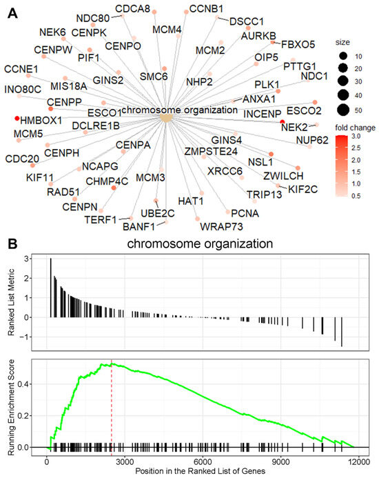 Chromosome organization is a major activated pathway in HDAC11-overexpressing CMSCs. (A) The cnetplot shows the network of genes associated with the chromosome organization pathway, highlighting their interconnections. The node size corresponds to gene connectivity within the pathway, and the color gradient reflects the fold change in expression, with red representing the highest fold change. (B) The GSEA plot demonstrates the enrichment of the chromosome organization gene set. The running enrichment score (green line) peaks at the leading-edge subset (indicated by the red dashed line), showing a significant overrepresentation of chromosome organization genes at the top of the ranked gene list. Black tick marks below the plot indicate the positions of individual genes within the pathway.