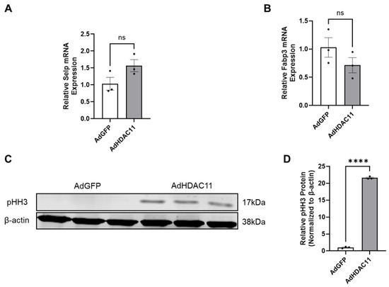 We validated several of the most differentially expressed genes identified by RNA-seq using qRT-PCR. Specifically, we selected SELP for validation as an upregulated mRNA because it was among the top-two most upregulated genes (excluding HDAC11) in the heatmap shown in Figure 2A. Similarly, we chose FABP3 as a representative downregulated gene, as it was one of the top-two most downregulated mRNAs in the same heatmap. In addition to its strong differential expression, FABP3 is biologically relevant due to its role in the uptake, intracellular transport, and metabolism of long-chain fatty acids [58]. Given that HDAC11 activity is influenced by normal levels of free fatty acids and is implicated in metabolic regulation, the selection of FABP3 also aligns with our interest in exploring the metabolic consequences of HDAC11 overexpression. The results indicated that SELP mRNA levels showed an increasing trend (Figure 6A), while FABP3 mRNA levels exhibited a decreasing trend (Figure 6B). To evaluate the effect of HDAC11 overexpression on cell proliferation, we analyzed pHH3, a marker of M-phase. As shown in Figure 6C,D, HDAC11-overexpressing CMSCs exhibited significantly increased protein level of pHH3 compared to Ad-GFP controls, indicating enhanced cell proliferation upon HDAC11 overexpression. These results suggest HDAC11 overexpression promotes cell proliferation in CMSCs.