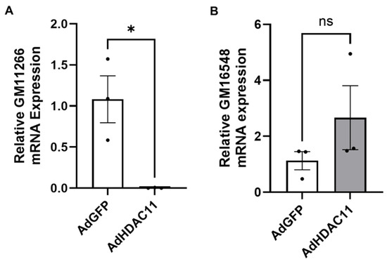 Validation of differentially expressed lncRNAs by qRT-PCR in CMSCs. (A) GM11266 expression was significantly downregulated in Ad-HDAC11-transduced CMSCs compared to Ad-GFP controls (* p ≤ 0.05). (B) GM16548 expression showed an increasing trend in Ad-HDAC11-transduced cells but was not statistically significant (ns). Data are presented as the mean ± SEM (n = 3). Statistical analysis was performed using a Student’s t-test.
