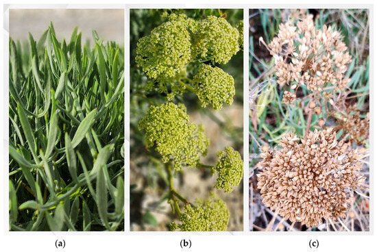 Sea fennel (a) leaves, (b) flowers, and (c) fruits.