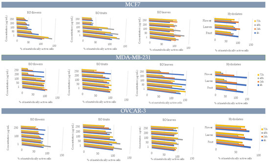 Percentage of metabolically active human breast adenocarcinoma MDA-MB-231, human breast metastatic adenocarcinoma MCF-7, and human ovarian carcinoma OVCAR-3 cell lines after 4, 24, 48, and 72 h of incubation with different concentrations of sea fennel essential oils and hydrolates from leaves, flowers, and fruits.