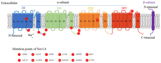 Degeneracy is a phenomenon that widely exists in the biological system; it has been found in different types of neurons and plays an important role in neuronal spiking via ion channels [13,14,15]. Our recent study indicates that both Nav1.3, Nav1.7, and Nav1.8, depending on the culturing time, can govern the repetitive spiking in small DRG neurons that respond to nociceptive pain [16]. These results suggest that the excitability of sensory neurons is attributed to a combination of different VGSCs and that degeneracy of ionic channels, including Nav1.8, except for Nav1.7, which has been a focus for chronic pain but does not demonstrate effective therapeutic strategies in clinics [4,6,7,17], should be equally considered when studying chronic pain. Since there are several reviews about Nav1.7 in chronic pain [4,5,6,17], we will focus on the recent findings of Nav1.8 in chronic pain in this review.
