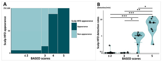Comparison of scalp HFOs stratified by BASED scores. (A) Mosaic plot shows the proportion of patients with scalp HFO appearance stratified by BASED score. (B) Violin plot shows the comparison of scalp HFO detection rates stratified by BASED score. Subjects were classified into four groups stratified by BASED score: less than 2, 3, 4, and 5. Each point shows individuals, and each shaded area shows the distribution of the scalp HFO detection rates. The bold horizontal lines indicate the median values for each group, and the dotted lines indicate the quartile range (25th–75th percentiles). Abbreviations: BASED score, burden of amplitudes and epileptiform discharges score; HFO, high-frequency oscillation. * p < 0.05. ** p < 0.01. *** p < 0.001.