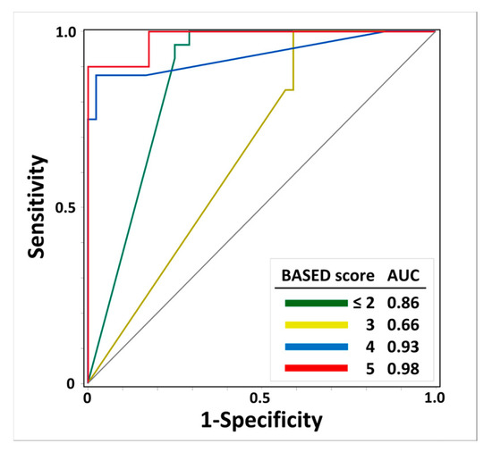 Figure 3 shows the results regarding the AUC-ROC and scalp HFO detection rates for the prediction of BASED scores. The AUC-ROCs of the scalp HFO detection rates for BASED scores ≤ 2, 3, 4, and 5 were 0.86, 0.66, 0.93, and 0.98, respectively, with the highest identification for a BASED score of 5, followed by a BASED score of 4.