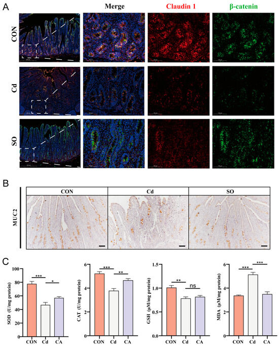 In order to investigate the damage mechanism of Cd exposure on intestinal barrier integrity and the therapeutic effect of SO, we firstly analyzed the expression of tight junction proteins, claudin1, and β-catenin by immunofluorescence double-staining. The results showed that Cd exposure significantly disrupted the structural integrity of the intestinal barrier, as evidenced by diminished claudin1/β-catenin co-localization; whereas SO treatment restored this trend, suggesting its protective effect on the tight junction structure (Figure 2A). Give that the mucus barrier is the first line of defense against harmful substances in the intestinal lumen, and the secretion status of its core component, MUC2, directly affects intestinal permeability [30]. We further assessed the MUC2 expression by immunohistochemistry. The results showed that the number of MUC2-positive cells was significantly reduced in the Cd group compared with the CON group, and SO treatment significantly increased the number of MUC2-positive cells (Figure 2B). Oxidative stress is an important mechanism of heavy metal toxicity [31], so, we further understood oxidative stress status. The results showed that Cd exposure significantly decreased SOD, CAT, GSH levels, while elevating MDA levels. Notably, SO treatment demonstrated potent restorative efficacy in reversing these abnormal changes (Figure 2C). These data suggest that Cd exposure may lead to disruption of tight junctions by disrupting redox homeostasis, and that the gut-protective effects of SO may be closely related to its antioxidant properties [21].