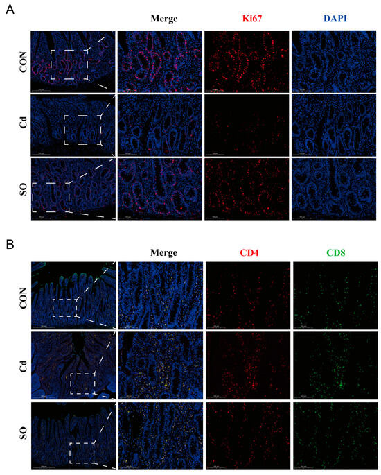 To systematically assess the multifaceted effects of Cd exposure on intestinal homeostasis, we further explored its regulatory effects on epithelial regenerative capacity and immune microenvironment. Continuous regeneration of intestinal epithelial cells is a central mechanism of barrier repair [32], we examined the proliferative activity of epithelial cells by Ki67 immunofluorescence staining. The results showed that the number of Ki67-positive cells was significantly reduced in the Cd group compared with the CON group, suggesting that Cd significantly inhibited the proliferation of epithelial cells; whereas SO treatment partially restored the number of Ki67-positive cells (Figure 3A). Notably, disruption of the intestinal barrier is often accompanied by hyperactivation of the immune system [33]; therefore, we analyzed lymphocyte infiltration in the lamina propria by CD4/CD8 immunofluorescence staining, the result demonstrated that CD4+ and CD8+ T-cell populations were significantly increased in the Cd group compared with the CON group, suggesting that Cd exposure may disrupt immune function and promote inflammation occurrence. Strikingly, SO treatment reversed this trend, significantly reducing CD4+ and CD8+ T-cell infiltration, which underscores the potential function of SO to restore immune homeostasis (Figure 3B).