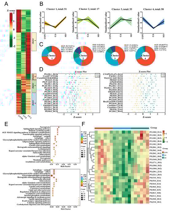 Sodium octanoate broadly regulates jejunal lipid metabolism. (A) DALs were clustered and plotted as a heatmap. (B) Four clusters (clusters 1–4) were highlighted, and the trend lines indicating the change in levels in the jejunum of these DALs were shown. (C) DALs in each cluster were subcategorized based on their lipid classes. (D) Distribution of the top 20 DALs in the CON group compared to the Cd group and the Cd group compared to the SO group. (E) KEGG enrichment analysis of DALs in CON vs. Cd group and Cd vs. SO group. (F) Heat map of DALs associated with Glycerophospholipid metabolism.