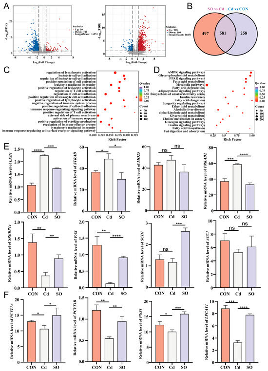 Sodium octanoate broadly modulates the jejunal transcriptional profile. (A) Volcano plots of DEGs (CON vs. Cd, Cd vs. SO). (B) Venn diagram of DEGs in the CON group vs. Cd group and Cd group vs. SO group. (C) GO enrichment analysis of DEGs in the Cd and SO groups. (D) KEGG enrichment analysis of DEGs in the Cd and SO groups. (E) LKB1, STRAD, MO25, PRKAB2, SREBP1c, FAS, SCD1 and ACC1 gene expression levels in the three groups. (F) PCYT1A, PCYT1B, PGS1 and LPCAT1 gene expression levels in the three groups. All the above experiments were repeated three times independently and the data were expressed as “Mean ± standard deviation (SD)” (* p < 0.05, ** p < 0.01, *** p < 0.001, **** p < 0.0001).
