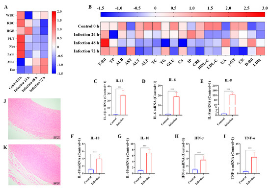 The effects of G. parasuis on the routine blood indicators, biochemical parameters, cytokine production, and blood vessel tissue damage of piglets. On 24 h, 48 h, 72 h infected by G. parasuis, the blood were collected and the routine blood indicators (A) and biochemical parameters (B) were determined. At 72 h after being challenged by G. parasuis, the mRNA levels of IL-1β (C), IL-6 (D), IL-8 (E), IL-18 (F), IL-10 (G), IFN-γ (H), and TNF-α (I) in the blood vessels were assessed using RT-PCR, and the blood vessels from the control group (J) and the infection group (K) were obtained for pathological analysis. Hemoglobin: HGB; eosinophils: Eos; total protein: TP; total cholesterol: TC; triglycerides: TG; calcium: Ca; uric acid: UA; *** p < 0.001.