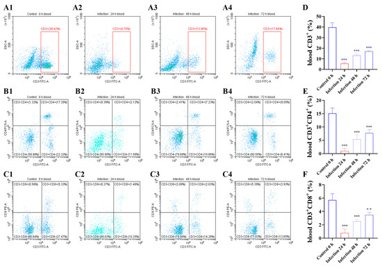 Following infected by G. parasuis at 24 to 72 h, piglet bloods were collected to determine CD3+, CD3+CD4+, and CD3+CD8+ T cell proportions. (A1–A4,D): the CD3+ T cells; (B1–B4,E): the CD3+ CD4+ T cells; (C1–C4,F): the CD3+ CD8+ T cells; ** p < 0.01; *** p < 0.001.