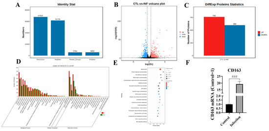 Proteomic analysis of piglet blood vessels after G. parasuis challenge. (A) The quantified proteins from the proteomic analysis; (B) volcano plot of the dysregulated proteins; (C) differentially expressed proteins (DEPs) in the infection group and the control group; (D) GO enrichment analysis of the DEPs; (E) KEGG analysis of the differentially expressed proteins; (F) detection of the CD163 expression level by RT-PCR; INF: the infection group; CTL: the control group; ### p < 0.001.