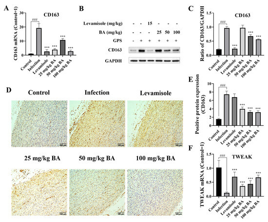 When the piglets were infected with G. parasuis, the CD163 mRNA expression level was significantly increased, and the mRNA level of TWEAK was significantly decreased in the infection group (p < 0.001), as shown in Figure 4A,F. Levamisole could attenuate the CD163 mRNA expression level and alter the TWEAK mRNA expression level compared to the infection group (p < 0.001). The 25, 50 and 100 mg/kg of baicalin diminished CD163 mRNA expression and increased the TWEAK mRNA expression level from the blood vessels compared to the infection group (p < 0.001).