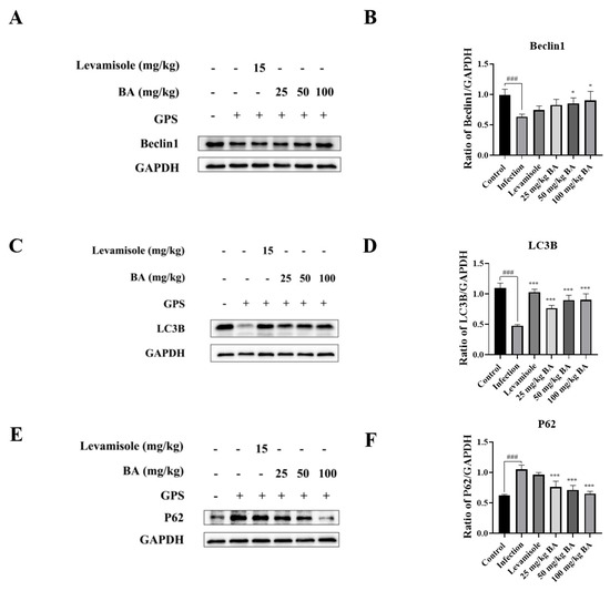 The function of baicalin on autophagy in the blood vessels of G. parasuis-infected piglets. Beclin1 (A,B), LC3B (C,D), and p62 (E,F) expression levels were assessed using Western blot. BA: baicalin; ### p < 0.001 versus control; * significance present at p < 0.05; *** significance present at p < 0.001. Original images can be found in Supplementary Materials.