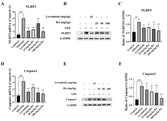 As displayed in Figure 7A,D, the mRNA expression levels of NLRP3 and Caspase 1 in the infection group were raised compared to the control group (p < 0.001). Compared to the infection group, levamisole and 25 to 100 mg/kg of baicalin attenuated NLRP3 and Caspase 1 mRNA expression levels (p < 0.001). At the protein levels, NLRP3 and Caspase 1 were raised from the infection group compared to the control group (p < 0.01), as shown in Figure 7B,C,E,F. Compared to the infection group, treatment with levamisole and 25 mg/kg–50 mg/kg of baicalin reduced the NLRP3 and Caspase 1 expression levels (p < 0.05).