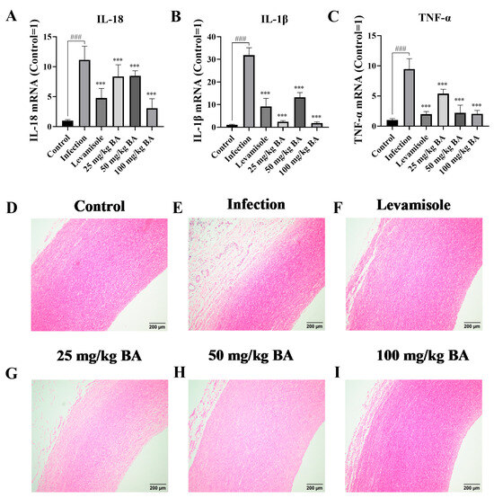 The data showed that G. parasuis significantly induced the mRNA expression levels of IL-1β, IL-18, and TNF-α in the blood vessels (p < 0.001), as shown in Figure 8A–C. When the piglets were administered levamisole or baicalin, the mRNA expression levels of IL-1β, IL-18, and TNF-α in the blood vessels were weakened compared to the infection group (p < 0.001).