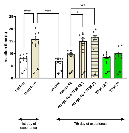 Based on the two-way ANOVA, statistically significant changes in the reaction time to nociceptive stimulus were confirmed after acute and chronic morphine administration. A day effect (F(1,32) = 55.68; p < 0.0001), drug effect (F(1,32) = 97.13; p < 0.0001), and interaction effect (F(1,32) = 22.26; p < 0.0001) were observed. Additionally, one-way ANOVA showed statistically significant differences in animal behavior on the seventh day of the experiment (F(5,52) = 7.680; p < 0.0001).