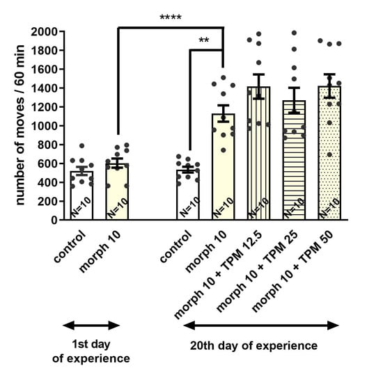 Effect of topiramate (TPM) (12.5; 25; 50 mg/kg, i.p.) on the acquisition of sensitization to the locomotor effects of morphine (Morph) (10 mg/kg, i.p.) in Mice; ** p < 0.01; **** p < 0.0001 (Tukey’s test). Total number of mice in this experiment = 70.