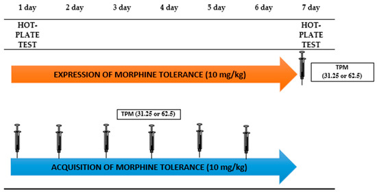 The effect of topiramate on the acquisition of morphine tolerance was assessed by the administration of topiramate once a day for six consecutive days (from day 1 to day 6 of the experiment) in the morning, 30 min prior to the morning morphine dose. On day 7, mice received only a morphine injection, and 30 min later, the hot-plate test was conducted.
