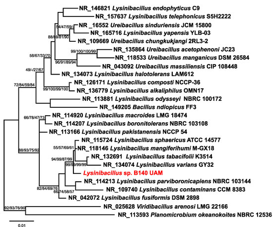 Phylogenetic tree for assignment of the isolate B140 UAM (in red) as a Lysinibacillus species. The tree structure shown is that of the neighbour-joining analysis, and the numbers in the branching points are the bootstrap values for, from left to right, the analyses using the maximum likelihood, minimum evolution, maximum parsimony, and neighbour-joining methods, respectively. The bar indicates the scale of the branches’ phylogenetic distances.
