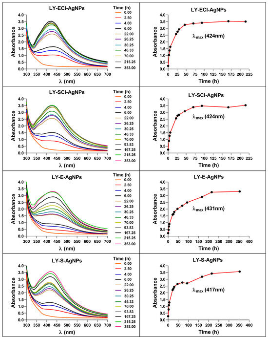 Changes in the UV-Vis spectra of the AgNPs during their synthesis. The right panels show the synthesis kinetics from the increase in absorbance at the corresponding λmax (indicated in brackets).