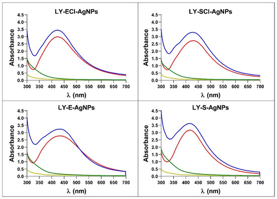 UV-Vis spectra of AgNPs, broths, and washing waters during the collection of AgNPs after their synthesis. In blue, AgNPs synthesis reactions; in red, AgNPs after washing; in green, supernatants after AgNPs collection; in yellow, Milli-Q water from the last wash.