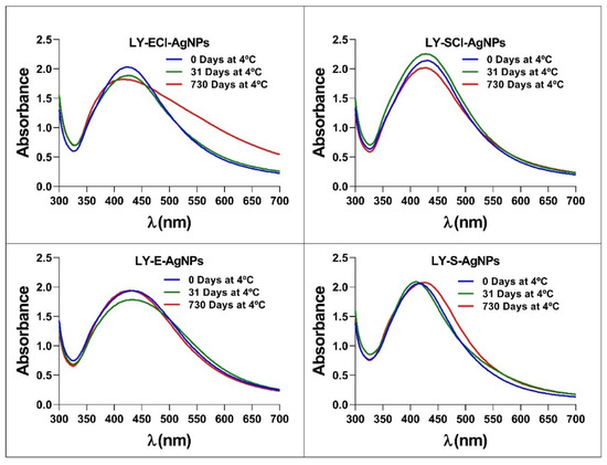 Analyses determined the possibility of preserving the AgNPs at 4 °C and in the dark concerning their structural stability and antibacterial activity. The UV-Vis spectra registered after different periods showed no changes initially up to one month after the AgNPs’ collection. The experiment followed up to 2 years, and only the LY-ECl-AgNPs showed an increase in absorbance at λ550, indicating some aggregation of the AgNPs after this very long time (Figure 5). Additionally, the MIC values against E. coli for each AgNP kept under these conditions during the different periods remained unchanged, as shown in Table S1. In a previous study, we showed other AgNPs to be stable for up to at least two weeks of conservation in the same conditions [56]. Other authors also observed this behaviour for chemical AgNPs kept at 4 °C for 78 days without affecting their spectra or even for a year with minimal variation compared to the same AgNPs kept at room temperature [72]. Moreover, Pham [73] also used the conservation of AgNPs at 4 °C, and Dede et al. [74] mentioned that the AgNPs produced in their work retained their properties for one year, although they did not mention the preservation method. Finally, previous work from our laboratory showed that biogenic AgNPs kept at 4 °C for ten months in the light retained their spectra and most of their antibacterial activity. In contrast, those kept at 30 °C ceased to be active when analysed after the same time [33]. All these data indicate that biogenic AgNPs can retain their properties, like chemical AgNPs, for a certain period when refrigerated at 4 °C, which facilitates their use. The current study is the first of this kind to test the stability of biogenic AgNPs for very long periods, showing that most of the tested biogenic AgNPs can be conserved in the dark at 4 °C, with no or only a slight effect on their aggregation.