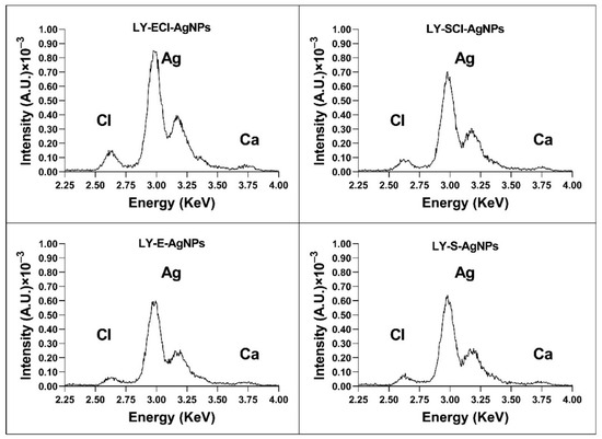 The hydrodynamic sizes of the AgNPs (Table 2, Figure S2) were very close for AgNPs from media with NaCl (LY-ECl-AgNPs and LY-SCl-AgNPs), with diameters of 48.5 nm and 52.7 nm, respectively, but more different for the AgNPs from media without NaCl (LY-E-AgNPs and LY-S-AgNPs), with diameters of 80.2 nm and 63.3 nm, respectively. Moreover, the AgNPs from media without NaCl had the highest hydrodynamic diameters of all the AgNPs prepared in this work, presenting a higher difference with the corresponding metallic core diameters, suggesting thick coronas. Other authors also observed a considerable increase in the size of AgNPs when comparing the core and hydrodynamic sizes, obtaining similar conclusions to those obtained in this work [19,49,51,52,54].