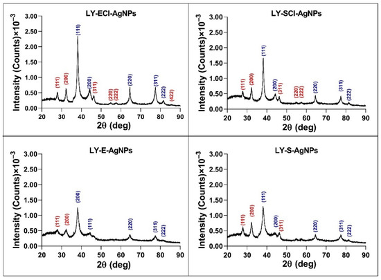 XRD patterns of the AgNPs. Planes of Ag0 (blue) and AgCl (red) crystals are indicated.