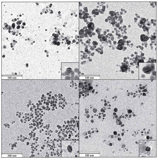 An analysis of the AgNPs TEM images allowed us to determine the shape and average size of the AgNPs’ metallic cores. The nanoparticles obtained in this study were, generally, quasi-spherical, with a minority of other morphologies (Figure 8). AgNPs produced by different biological methods have shown, as in the current case, the predominance of quasi-spherical forms, whether synthesised by Lysinibacillus cultures [49,51,54], other bacteria, or different microorganisms [3,10,11]. Despite this, several articles and reviews have established a variety of AgNP shapes, which may be related to the methodologies and materials used in their synthesis, so that by varying them in a controlled manner, nanomaterials of one shape or another could be obtained [81,82,83,84].